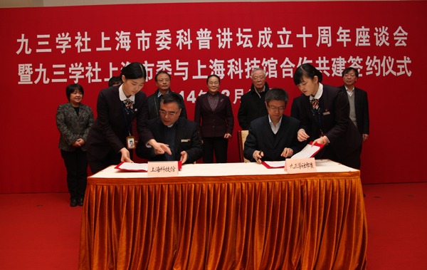 签约仪式上,周锋、王小明代表九三学社市委和上海科技馆在合作共建协议上签字,双方将围绕“发掘人才优势、整合科普资源”的目标在科学普及和传播等工作中开展合作共建。