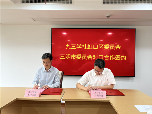 为贯彻落实《国务院关于新时代支持革命老区振兴发展的意见》和《上海市人民政府、福建省人民政府关于印发〈上海市与三明市对口合作实施方案(2023—2025年)〉的通知》等文件精神,准确把握“优势互补、互惠互利、共谋发展”原则,加强两地九三学社组织的沟通联系,5月17日至18日,九三学社福建省委专职副主委林修凤带队,一行4人,在九三学社上海市委专职副主委周锋陪同下,就社虹口区委与社三明市委对口合作工作,到访社虹口区委,举办了对口合作签约仪式,并进行交流座谈。中共区委统战部副部长、区台办主任李国庆,社虹口区委主委章冀龙,副主委狄洁姗、唐瑞卿、程芳等出席。