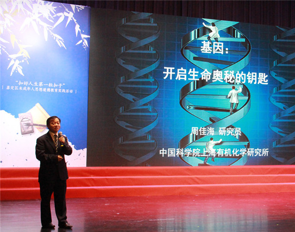 4月21日上午,社市委嘉定市民修身大讲堂启动仪式后,大讲堂讲师团副团长、社中科院上海分院委员会副主委、中科院上海有机化学研究所研究员周佳海首开主题讲座《基因,开启生命奥秘的钥匙》,约500人在嘉定区文化馆聆听。