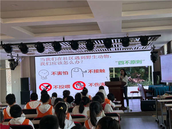 上海林业总站工程师张文文和社东方国际(集团)有限公司委员会副主委、上海纺织博物馆馆长贾一亮在11月7日和8日下午的报告主题同样有着密切联系。在澧溪小学,张文文带领该校100余名小学生开启了一场“森林探秘之旅”一一查看森林在“能吞能吐,净化水质”“追光捕碳,固碳释氧”“吐故纳新,净化大气”和“孕育生命,容纳万物”等方面的高超技能,张文文提醒同学们在遇到野生动物时要注意遵守“不害怕、不接触、不投喂、不伤害”的四不原则,共同守护山水林田湖草沙生命共同体。贾一亮在浦东外国语学校的报告则聚焦对多种自然资源的应用,通过一张张显微镜下的植物和矿物纤维图片,让同学们直观感受不同纤维的特点及其对衣物的材质以至形制和风格的影响。 在讲座过程中,她频频与同学们互动交流,在问答中帮助大家区分纺、织和绫罗绸缎等多组概念,讲解平纹、斜纹、锻纹等多种纺织科学知识,引导同学们建立多学科知识联结。最后,贾一亮还邀请同学们去纺织博物馆开展研学活动。