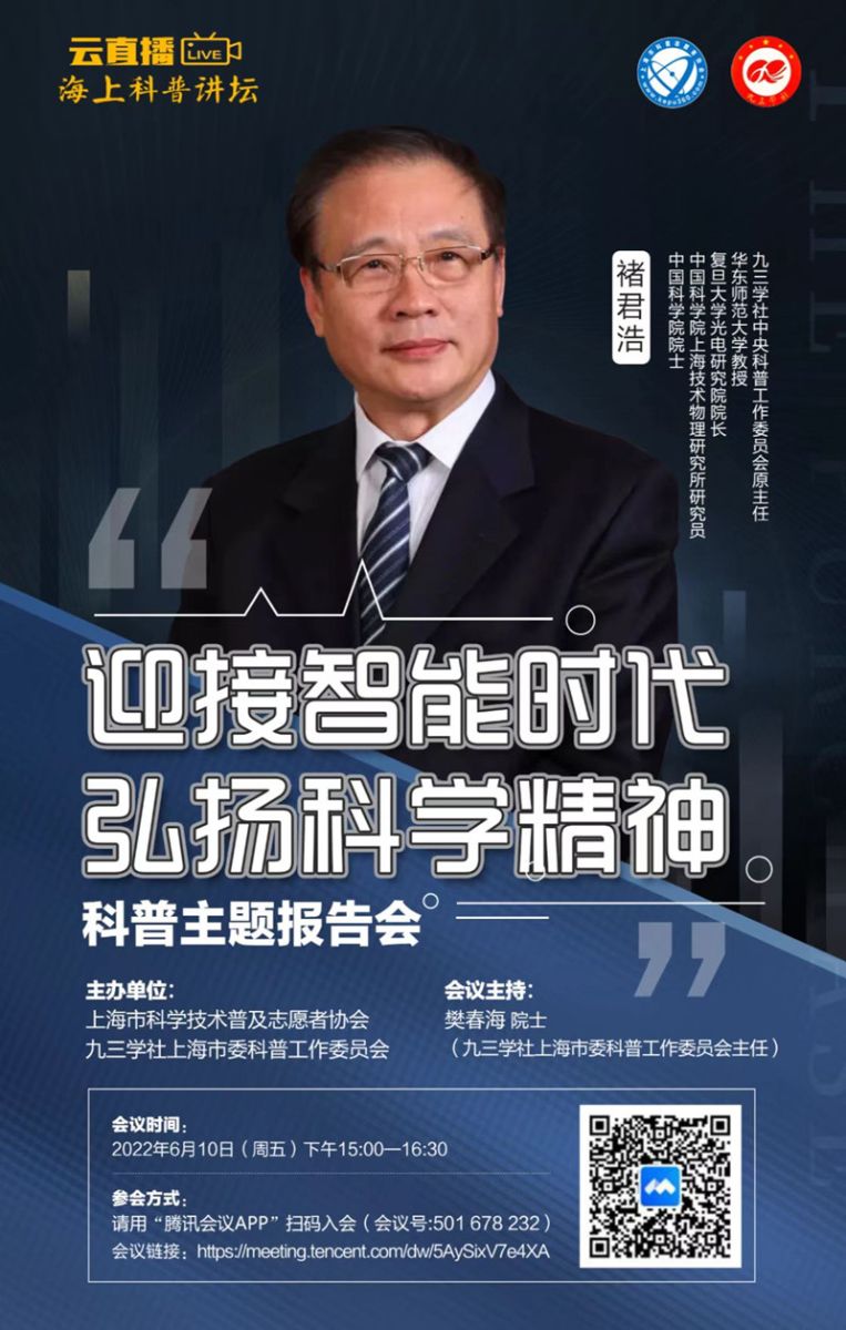 6月10日下午,九三学社上海市委科普工作委员会与上海市科普志愿者协会联合主办的“海上科普讲坛”迎来第二场线上报告会。本场报告会由社上海市委科普工作委员会主任、市科普志愿者协会理事长、中科院院士樊春海院士主持,特邀九三学社中央科普工作委员会原主任、社市委原副主委、中科院院士褚君浩院士做题为《迎接智能时代,弘扬科学精神》的专题报告。社内外中青年科学家与社会公众四百400余人次聆听了报告。