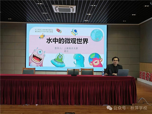 5月6日下午,在浦东新区秋萍学校,社员、上海海洋大学副教授凌云在报告《水下的微观世界》中,先从同学们熟悉的鱼、虾开始讲起,又逐一介绍了绿藻、蓝藻和细菌等水中生物。凌老师细致而生动地描述了这些生物的形态、生活习性以及在水生生态系统中的重要作用,为学生描绘出一幅完整的水下生物圈画面。凌老师的报告不仅拓宽了同学们的知识面,还提高了学生对水生生态系统的认识和保护意识。同学们在讲座结束后纷纷表示,要做保护水生生态环境的小卫士,从保护身边的每一滴水做起,共同守护美丽而珍贵的水下世界。