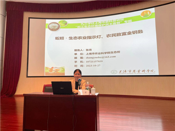 10月27日举办的奉贤区青溪•青村联合中学专场科普报告会上,新社员、上海农业科学院生态所助理研究员张月介绍了其科研团队在生态农业和生态修复方面的有益探索。在题为《蚯蚓:生态农业的指示灯、农民致富的金钥匙》的报告中,张月副研究员介绍了蚯蚓及其经济、药用价值,深入浅出地讲解了蚯蚓在生态农业发展的重要作用,进而展示了菜鳝蚓立体生态种养和稻蚓生态种养循环等农业模式的技术支撑、运行管理以及生态学和经济价值。整场讲座气氛热烈、互动频频、富有趣味。
