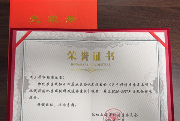 11月18日,杨浦区政协召开工作总结交流会,九三学社杨浦区委提交的提案《关于东走马塘内环线段滨水区域提升改造的建议》获评2020—2021年杨浦区政协优秀提案,社员、区政协委员蒋毅获区政协先进提案个人表彰。