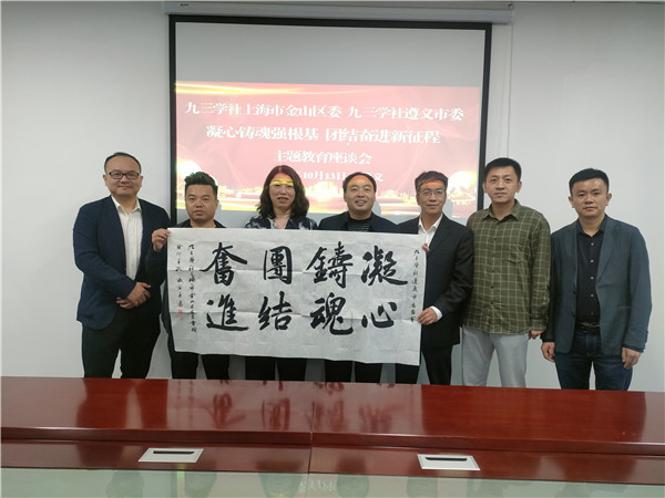 当天上午,九三学社金山区委和九三学社遵义市委开展“凝心铸魂强根基、团结奋进新征程”主题教育座谈会,双方就社务工作及主题教育开展情况进行交流讨论,并一致表示要在自身建设、履行职能等方面互相学习借鉴、取长补短。会上,社金山区委向、社遵义市委赠送社员盛兰军所题“凝心铸魂 团结奋进”书法作品。陆秋生和社遵义市委专职副主委黄光祥代表两地九三学社组织签订结对共建协议。