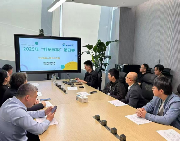 随后举行的专题座谈会上,美的集团中央研究院成员、社内专家贾文骥博士围绕工业机器人的技术分类、当前研究进展与未来应用前景作了系统分享。他从核心技术、行业落地、政策导向等多个维度展开阐述,引发了与会社员的浓厚兴趣与热烈讨论。大家结合自身专业背景,就机器人技术在青浦区高端制造业、生物医药、智慧物流等领域的融合应用展开了深入交流。