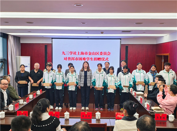邱晏代表社金山区委向普洱卫生学校11位贫困学生赠予爱心助学金11000元。黄光祥代表社遵义市委向社普洱市基层委赠送社员书法作品。