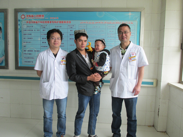 2014年9月5日,李军成功为一名两岁维族腹部外伤男孩实施胰十二指肠切除术,术后二十天患者康复出院。当天下午,患者因“驴车碾压腹部致腹痛5小时”入院。急查腹部CT提示腹腔积气、积液,考虑腹腔空腔脏器损伤并穿孔,给予积极抗休克治疗,并完善术前准备,与患者家属沟通后及时行剖腹探查术。术中见腹腔出血及消化液约300ml,十二指肠上段横断面80%断裂,胰腺颈部完全断裂,胆总管胰腺段完全断裂,结肠肝区系膜挫伤伴有血肿,余腹腔脏器未发现明显外伤表现。给予完全切除十二指肠及胰头,胃远端闭合,然后以Child氏法完成吻合,手术顺利完成。在李军及科室医护人员的精心照料下患儿度过了腹腔感染、胰漏及营养不良等难关,得以康复,术后二十天顺利出院。对于如此小的患儿,遭受如此大的创伤,并经受如此复杂的手术,能康复出院,可以说是奇迹。出院当天,患者的父亲拉着援疆医疗专家李军的手说:“感谢莎车县人民医院普外科全体医护人员的共同努力,感谢援疆医疗专家给予小孩第二次生命!”