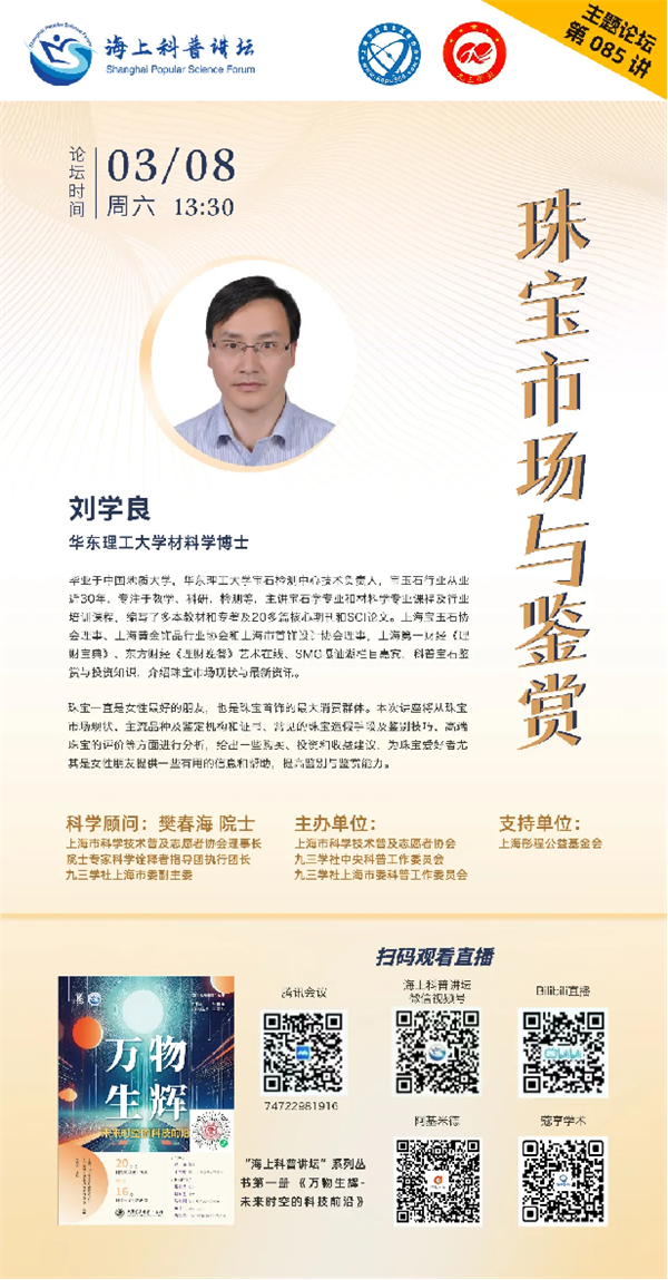 本周六,华东理工大学材料学博士刘学良将带来专题报告《珠宝市场与鉴赏》,从珠宝市场现状、主流品种、鉴定机构和证书、常见的珠宝造假手段及鉴别技巧、高端珠宝的评价等方面进行分析,给出一些购买、投资和收藏建议,为珠宝爱好者尤其是女性朋友提供一些有用的信息和帮助,提高鉴别与鉴赏能力。