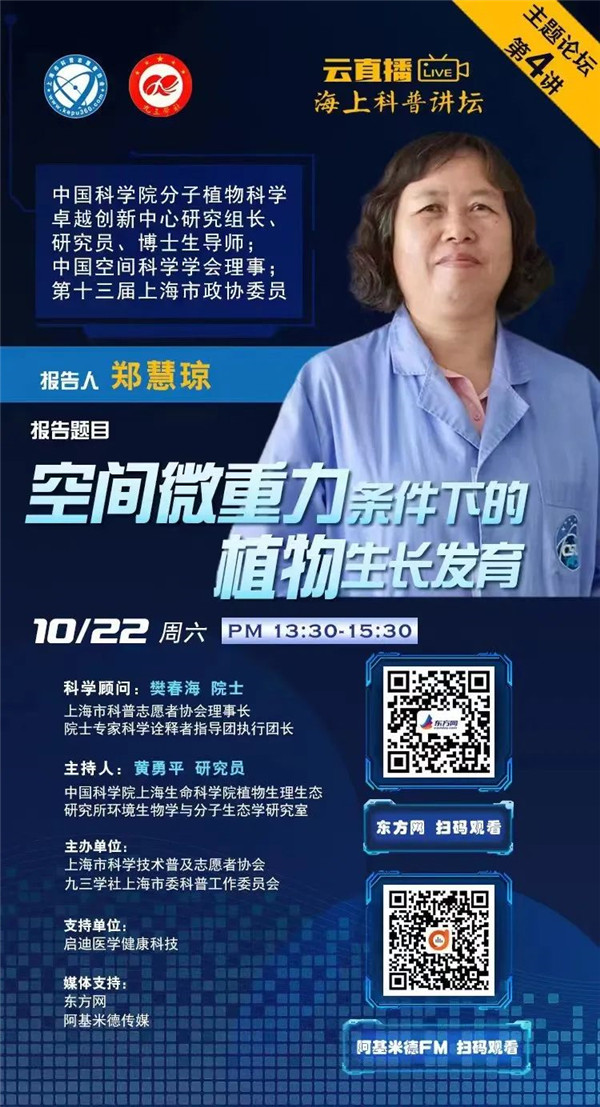 九三学社社员、中国科学院分子植物科学卓越创新中心研究组长、研究员、博士生导师,中国空间科学学会理事郑慧琼为我们带来《空间微重力条件下的植物生长发育》报告。
