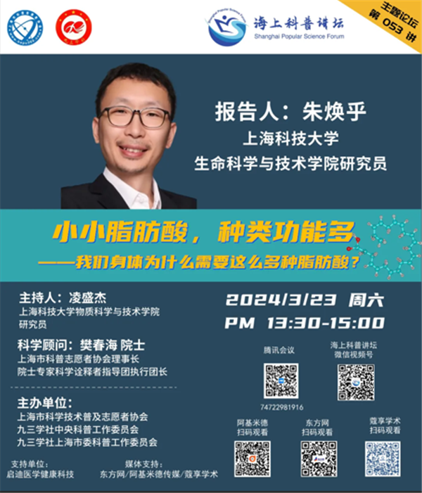 本周六,九三学社社员、上海科技大学生命科学与技术学院研究员朱焕乎将带来专题报告《小小脂肪酸,种类功能多——我们身体为什么需要这么多种脂肪酸?》,聚焦特定种类的脂肪酸在人类和模式动物发育和健康中起到的功能,结合近期领域里的一些重要进展进行相关介绍。希望能抛砖引玉,为大家提供一些思考。
