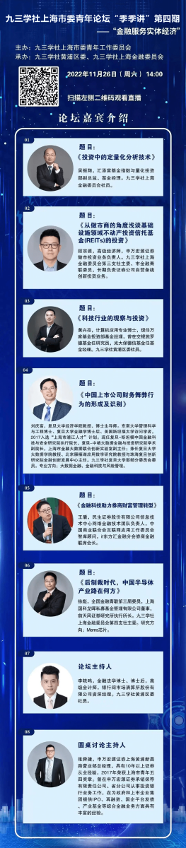 九三学社上海市委青年论坛“季季讲”第四期将于2022年11月26日下午2点举行。论坛将紧扣当下金融工作重点,聚焦“金融服务实体经济”。