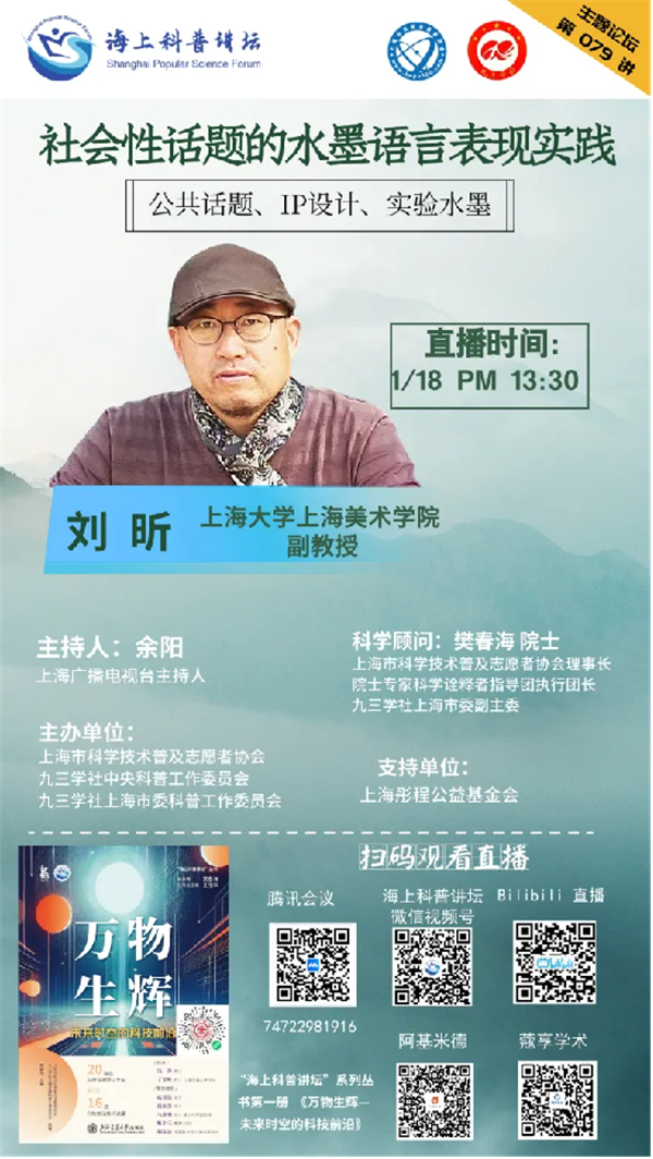 本周六,九三学社社员、上海大学美术学院副教授刘昕将带来专题讲座《社会性话题的水墨语言表现实践》,聚焦“公共话题”“IP设计”“实验水墨”,为大家开启一场别开生面的艺术探索之旅。