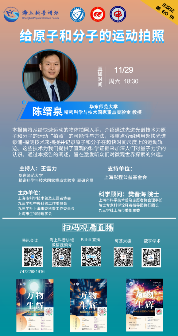 本期特邀华东师范大学精密科学与技术国家重点实验室教授陈缙泉,带来专题报告《给原子和分子的运动拍照》,带你了解如何捕捉并记录原子和分子在超快时间尺度上的运动轨迹 。