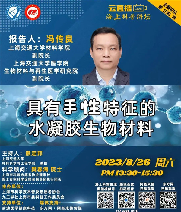 本周六,九三学社上海市委科技专门委员会副主任、上海交通大学委员会副主委,上海交通大学材料学院副院长、医学院生物材料与再生医学研究院副院长冯传良将分享 《具有手性特征的水凝胶生物材料》,为我们深入解析手性特征。