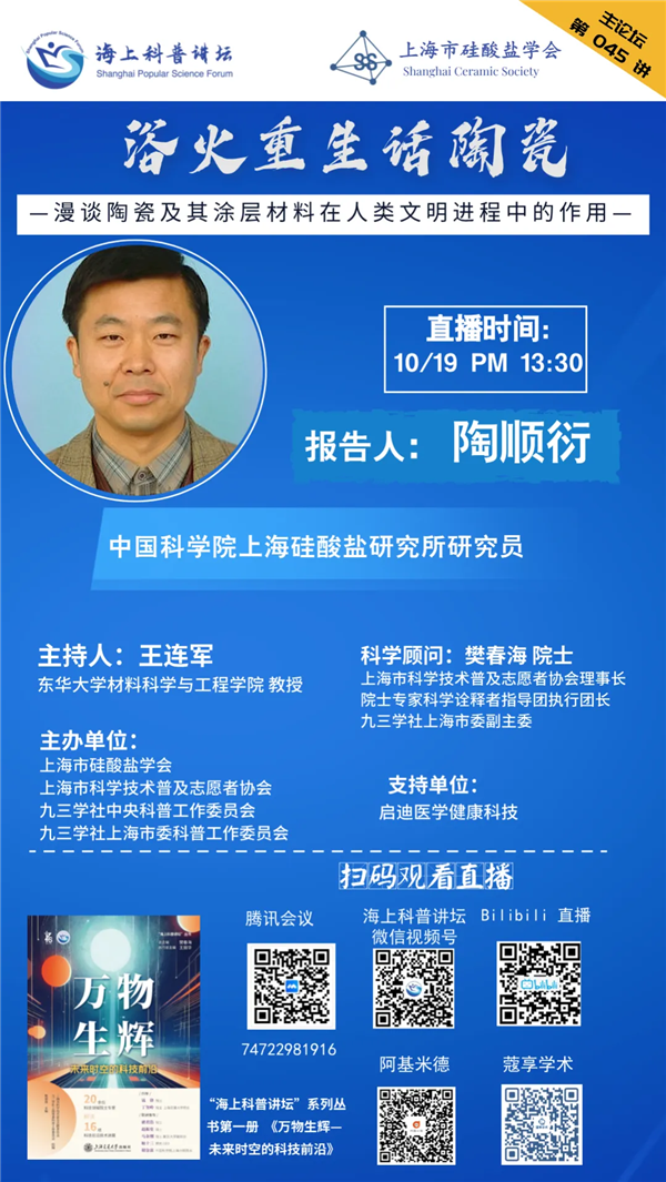 本周六,中国科学院上海硅酸盐研究所研究员陶顺衍将带来专题报道《浴火重生话陶瓷——漫谈陶瓷及其涂层材料在人类文明进程中的作用》,介绍人类控火、控温技术的演进带来的陶瓷工艺技术和陶瓷涂层技术的发展,及其在人类文明进程中的作用。