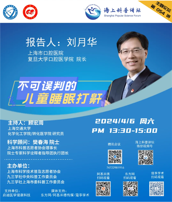 本周六,上海市口腔医院·复旦大学附属口腔医院院长刘月华将带来报告《不可误判的儿童睡眠打鼾》。他的研究团队多年来聚焦牙颌面发育畸形在睡眠呼吸障碍发生发展中的机制,揭示了该疾病不同年龄阶段患者特有的牙颌面三维形态特征,提出了“硬组织拓展引导软组织缩减”的多学科早期防治策略;并采用流行病学、表型组学、多中心随机对照临床试验等一系列研究方法,开展疾病的预警体系、治疗决策及个性化多学科诊疗体系建设的临床创新及转化研究,充分论证牙颌面发育畸形在睡眠呼吸障碍中的重要作用。