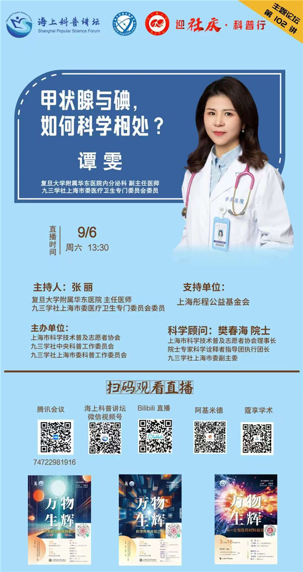 本期特邀九三学社上海市委医疗卫生专门委员会委员、复旦大学附属华东医院内分泌科副主任医师谭雯,带来专题报告《甲状腺与碘,如何科学相处?》,和大家聊聊甲状腺健康与碘摄入的关系。