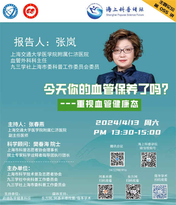 本周六,九三学社上海市委科普工作委员会委员、上海交通大学医学院附属仁济医院血管外科科主任张岚将为我们带来报告《今天你的血管保养了吗?——重视血管健康态》,解读泛血管疾病相关问题,并为我们在日常生活中如何进行血管保养提供有益指导。