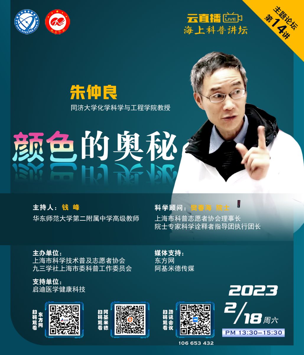 同济大学化学科学与工程学院教授朱仲良将带来专题报告——《颜色的奥秘》。