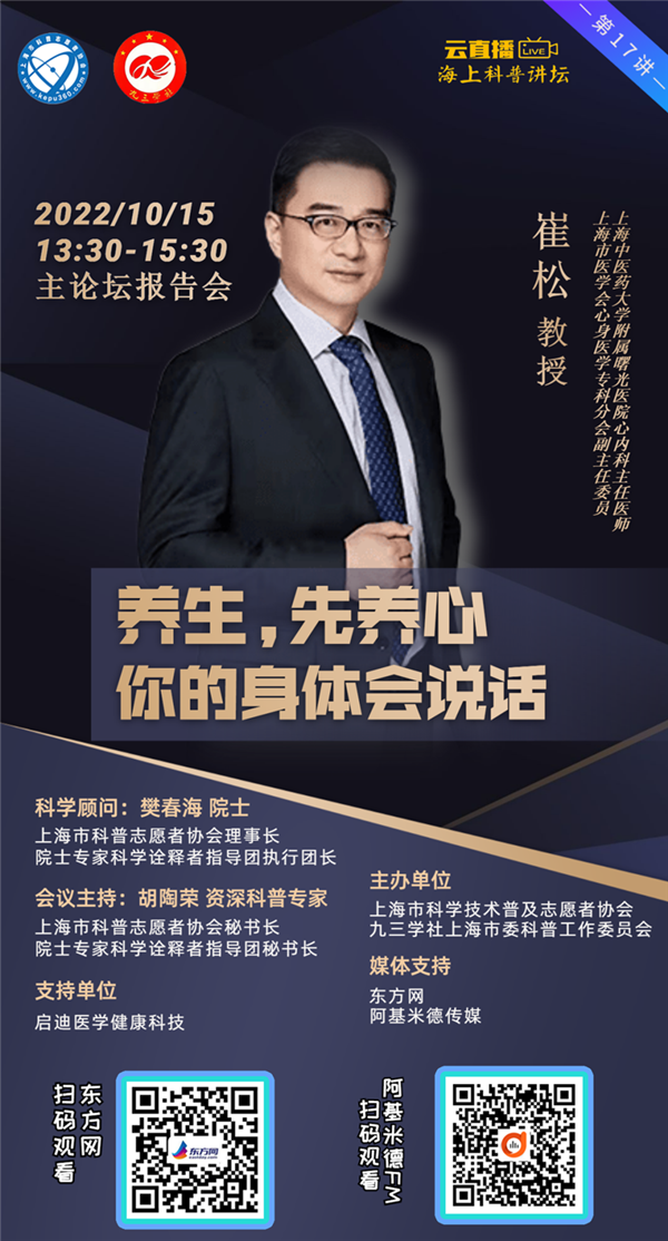 上海中医药大学附属曙光医院心内科主任医师、上海市医学会心身医学专科分会副主任委员、教授崔松将从心主血脉和心主神明两个方面,讲述怎样从现代医学和古人学说中汲取养分,科学养生,以心养生。