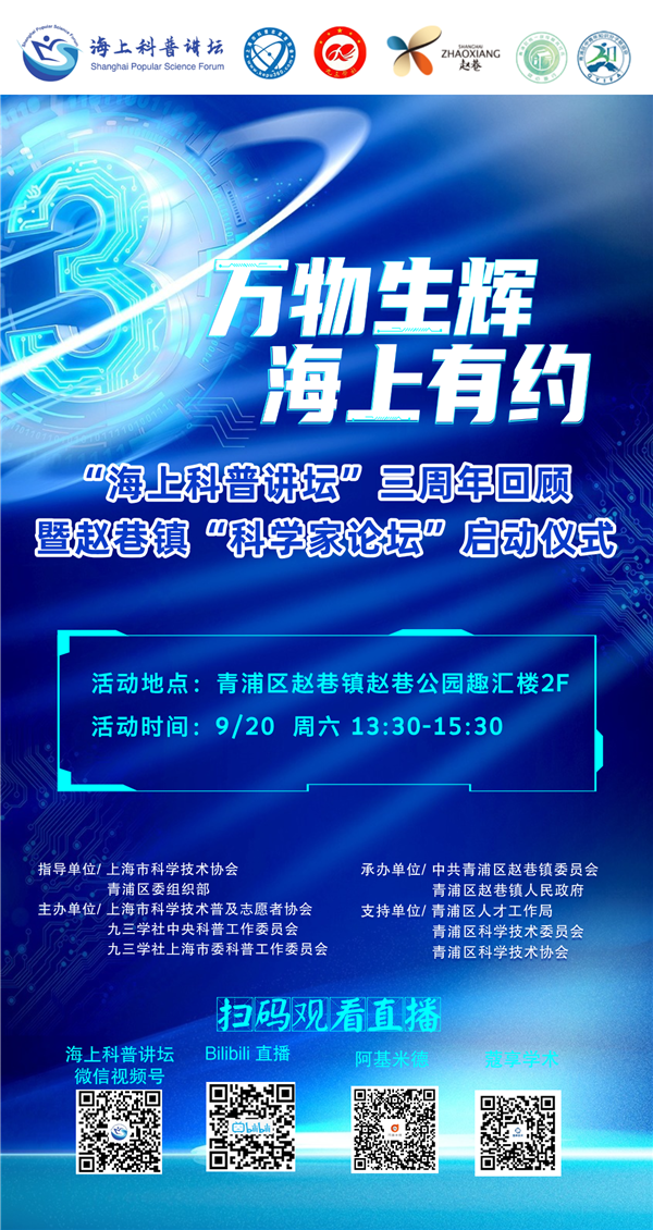 9月20日,万物生辉海上有约——“海上科普讲坛”创立三周年回顾活动暨赵巷镇“科学家论坛”启动仪式将在上海市青浦区赵巷公园举行。