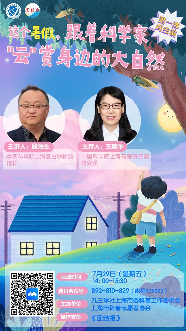 "垂緌饮清露,流响出疏桐。居高声自远,非是藉秋风。"第一讲,将由九三学社上海市委科普工作委员会委员、中国科学院上海昆虫博物馆馆长殷海生带领大小朋友们认识一“鸣”惊人的可爱昆虫——蝉。