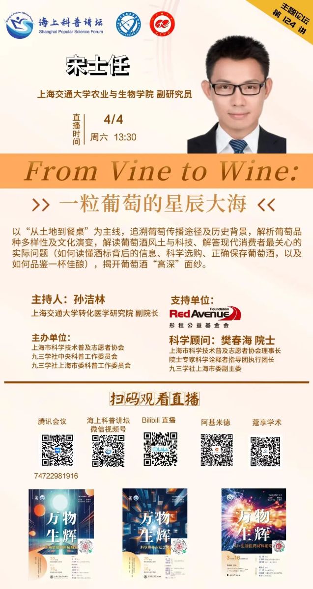 本期特邀上海交通大学农业与生物学院副研究员宋士任,作《一粒葡萄的星辰大海》专题报告。