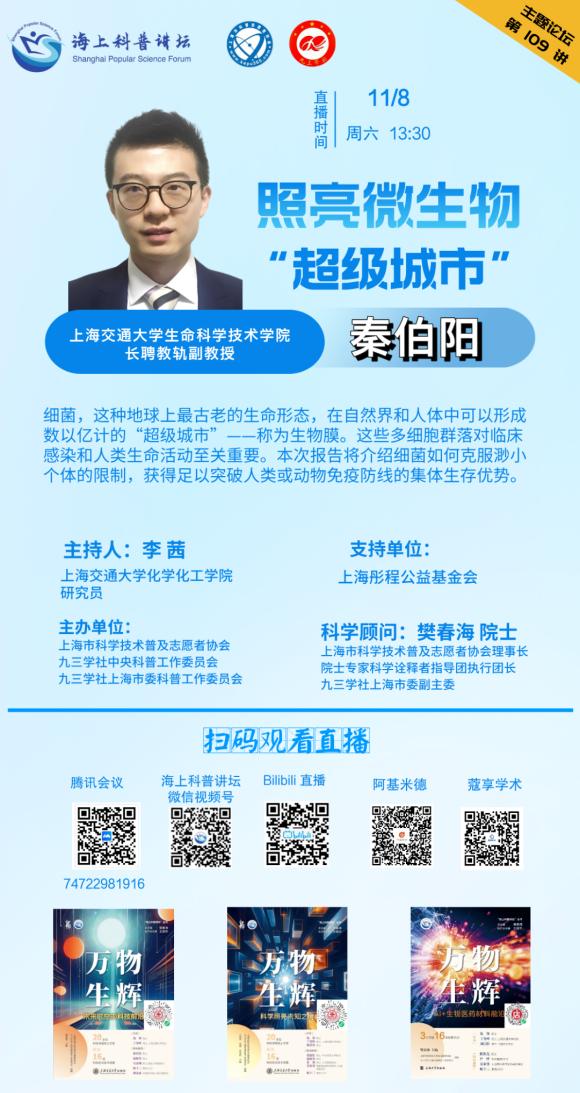 本期特邀上海交通大学生命科学技术学院长聘教轨副教授秦伯阳,带来专题报告《照亮微生物“超级城市”》,和大家聊聊细菌如何克服渺小个体的限制,获得足以突破人类或动物免疫防线的集体生存优势。一起来看看吧!