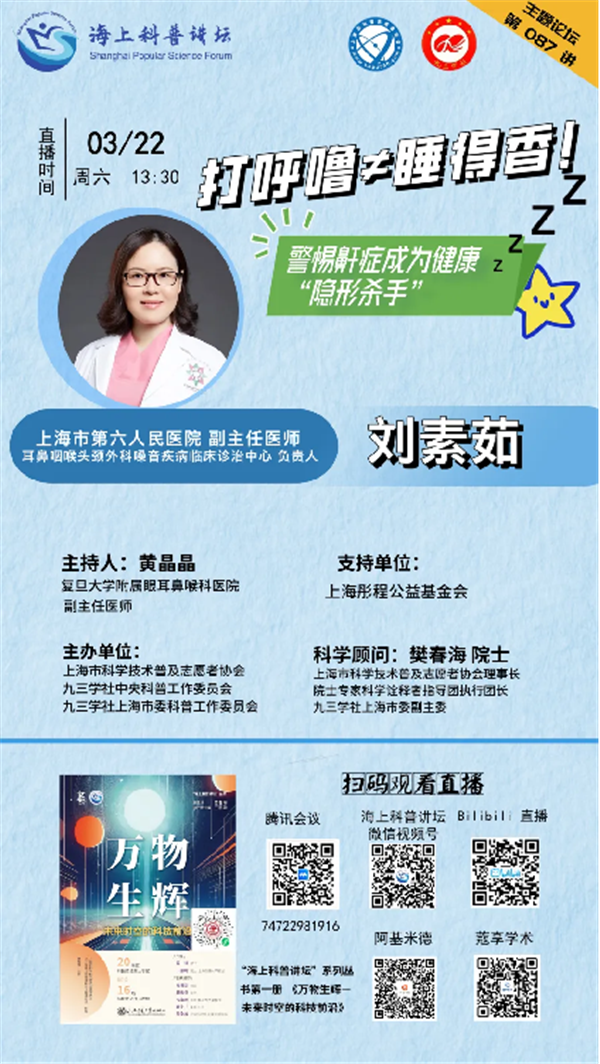 本周六,九三学社社员、上海市第六人民医院耳鼻咽喉头颈外科嗓音疾病临床诊治中心负责人、副主任医师刘素茹将带来专题讲座《打呼噜≠睡得香!警惕鼾症成为健康“隐形杀手”》。