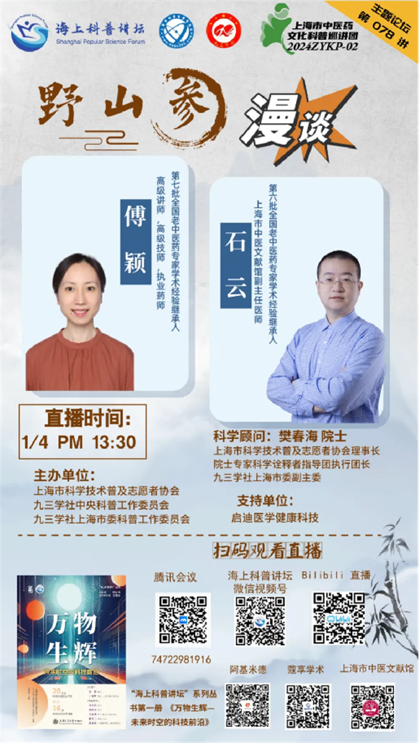 此前在大雪节气当天,我们推送的《微讲坛 | 冬令进补话人参》一文广受欢迎与关注。当下正值数九寒天里的二九时段,天气寒冷,正是人们关注养生进补之时,本次海上科普讲坛邀请九三学社上海市卫生健康委员会副主委、第六批全国老中医药专家学术经验继承人、上海市中医文献馆副主任医师石云,以及社员、第七批全国老中医药专家学术经验继承人、上海市医药学校高级讲师傅颖,一同漫谈野山参,为大家深入解读进补野山参的知识要点,助力大家科学养生,温暖过冬。