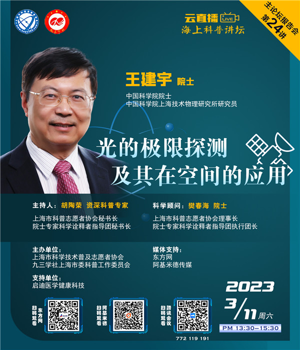 中国科学院院士、中国科学院上海技术物理研究所研究员王建宇院士将带来专题报告——《光的极限探测及其在空间的应用》。