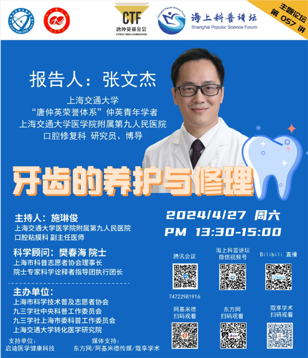 本周六,上海交通大学医学院“唐仲英荣誉体系”仲英青年学者、上海交通大学医学院附属第九人民医院口腔修复科研究员、博士生导师张文杰将带来报告《牙齿的养护与修理》,带您一起科学爱牙、护牙。