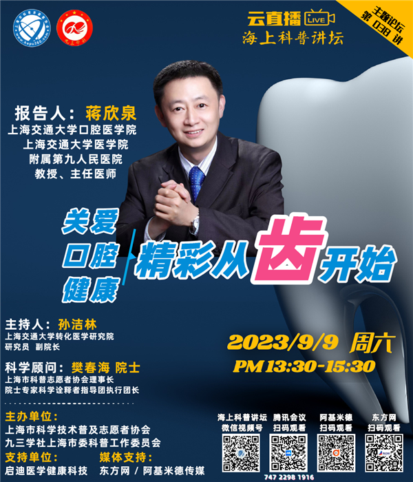 本周六,上海交通大学口腔医学院、上海交通大学医学院附属第九人民医院教授、主任医师蒋欣泉将为大家带来《关爱口腔健康,精彩从齿开始》,细说口腔医学的前世今生,与口腔相关的历史典故、名人轶事,口腔器官的演变过程,以及口腔科各分科处理的疾病范围,助您轻松获取口腔保健小知识。