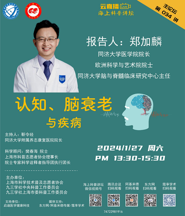 本周六,同济大学医学院院长、欧洲科学与艺术院院士、同济大学脑与脊髓临床研究中心主任郑加麟将带来《认知、脑衰老与疾病》,为大家详细阐述三者之间的联系。