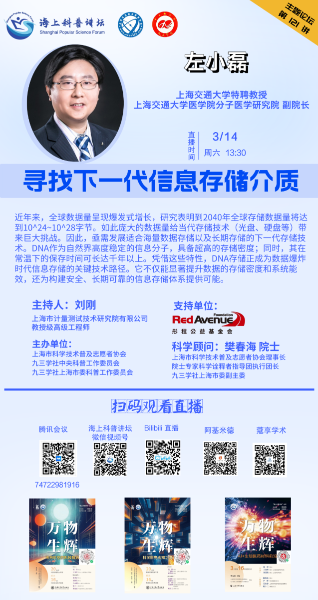 本期特邀上海交通大学特聘教授、上海交通大学医学院分子医学研究院副院长左小磊,作《寻找下一代信息存储介质》专题报告。