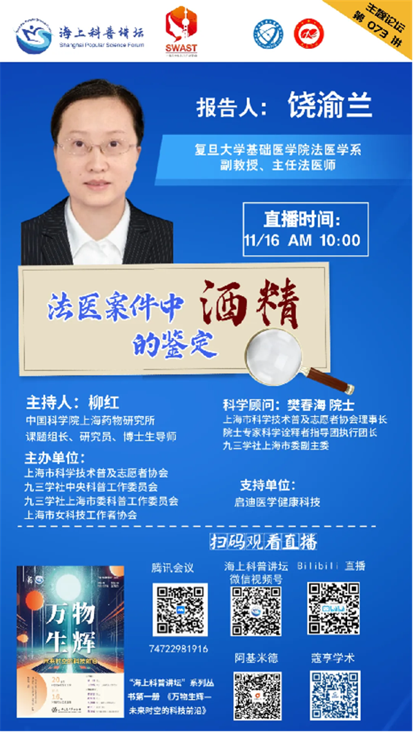 本周六,九三学社社员,复旦大学基础医学院法医学系副教授、主任法医师饶渝兰将带来专题讲座《法医案件中酒精的鉴定》。饶渝兰十余年来致力于酒精鉴定疑难案件的研究,发表相关论文13篇,授权发明专利2项。本次科普讲座她将和大家交流公众关心的以下问题:哪些法医学场景需要开展酒精鉴定?哪些食物会影响呼气酒精检测的结果?服用藿香正气水后驾车会被当成酒驾吗?拖延采样能否得到更低的检测结果?如何区分血液中测得的乙醇来源(来自死者生前摄入、死后产生)?