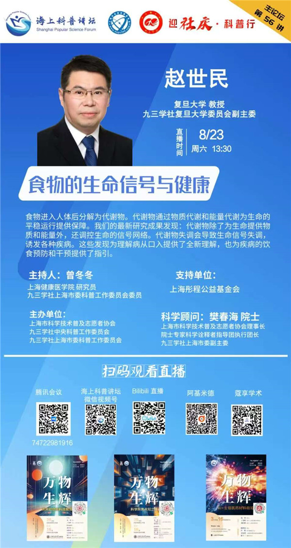 本期“迎社庆·科普行”专栏特邀九三学社复旦大学委员会副主委、复旦大学教授赵世民,带来专题报告《食物的生命信号与健康》。