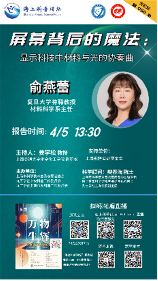 本周六,复旦大学特聘教授、材料科学系主任俞燕蕾将带来专题讲座《屏幕背后的魔法:显示科技中材料与光的协奏曲》。一起来听听吧!