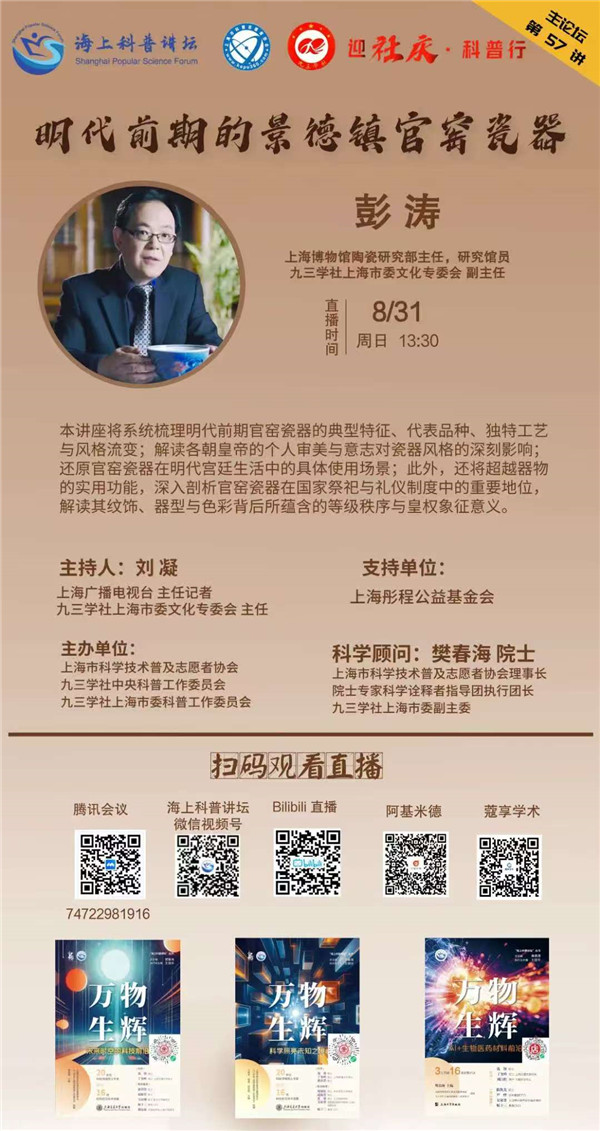 本期“迎社庆·科普行”专栏特邀九三学社上海市委文化专门委员会副主任、上海博物馆陶瓷研究部主任、研究馆员彭涛,带来专题报告《明代前期的景德镇官窑瓷器》。