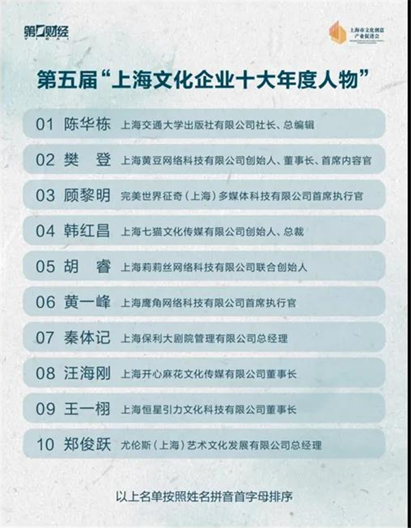 12月26日,第五届上海文化企业十强十佳十人推选结果正式揭晓。该推选旨在培育一批骨干龙头企业、发掘一批潜力创新企业、鼓励一批文化领军人物,为推动上海文化产业创新升级发展提供“源动力”。