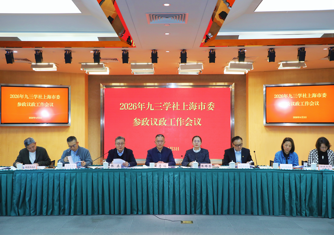 4月3日下午,九三学社上海市委召开2026年参政议政工作会议。社市委专职副主委詹咏、副主委张娣芳出席会议,社市委秘书长张磊主持会议。社市委各专(工)委,区委、直属基层组织相关负责同志及参政议政骨干近百人参加会议。