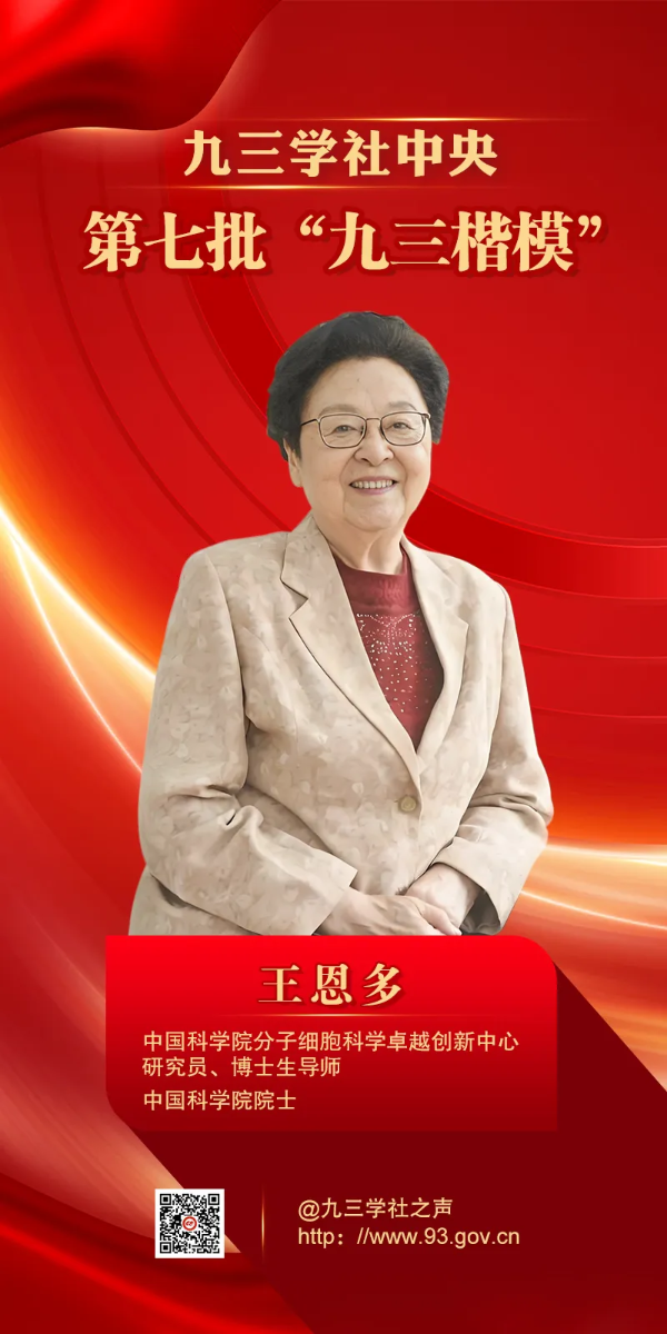 九三学社第十五届中央院士工作委员会委员、中国科学院分子细胞科学卓越创新中心研究员、中国科学院院士王恩多获第七批“九三楷模”荣誉称号。