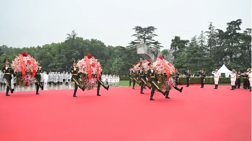 深情的《献花曲》中,14名礼兵稳稳抬起花篮,缓缓走向革命烈士纪念碑,将花篮敬放在纪念碑前。挺拔的红掌、盛放的百合,寄托着对人民英雄的深切缅怀和崇高敬意。