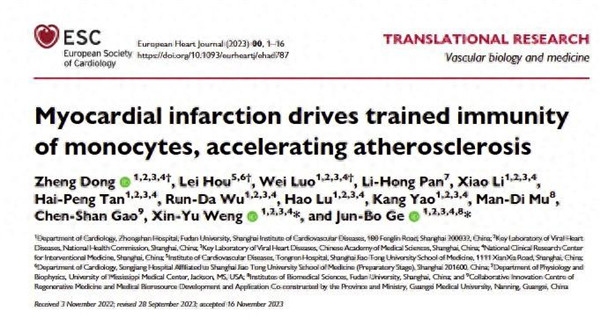 12月12日,复旦大学附属中山医院葛均波院士团队在European Heart Journal期刊(IF=39.3)在线发表了题为“Myocardial infarction drives trained immunity of monocytes, accelerating atherosclerosis”的研究论文。这项最新研究揭示了心肌缺血如何触发造血干细胞或单核细胞中的一种免疫训练状态,从而加速心肌缺血后动脉粥样硬化的发展。
