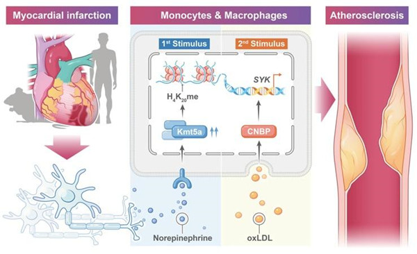 在12月发表的这项最新研究中,葛均波院士团队发现心肌缺血激活了交感神经系统,期间去甲肾上腺素释放引起的单核细胞的KMT5A表达增加,促进了动脉粥样硬化的进展。此外,高脂饮食增加了CNBP的表达,诱导了单核细胞的SYK的产生,进一步促进血管炎症和动脉粥样硬化的进展。通过使用小干扰RNA技术抑制KMT5A或CNBP,以及利用6羟基多巴胺(6-OHDA)抑制外周交感神经,可以减缓实验性心肌梗死后的加速动脉粥样硬化进展。