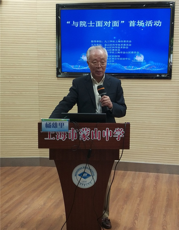 4月24日,由金山区科委、金山区教育局、九三学社金山区委主办的“与院士面对面”首场活动在蒙山中学举行。活动邀请了中科院院士杨雄里先生,为蒙山中学的师生作主题为《探索脑的奥秘》的报告。