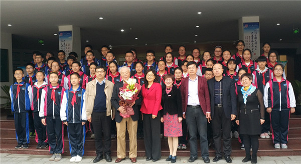 今年是金山区蒙山中学建校20周年,杨雄里院士亲笔写下了“为中国科学的腾飞勤奋学习!”勉励每一位蒙山学子,并与师生亲切合影留念。