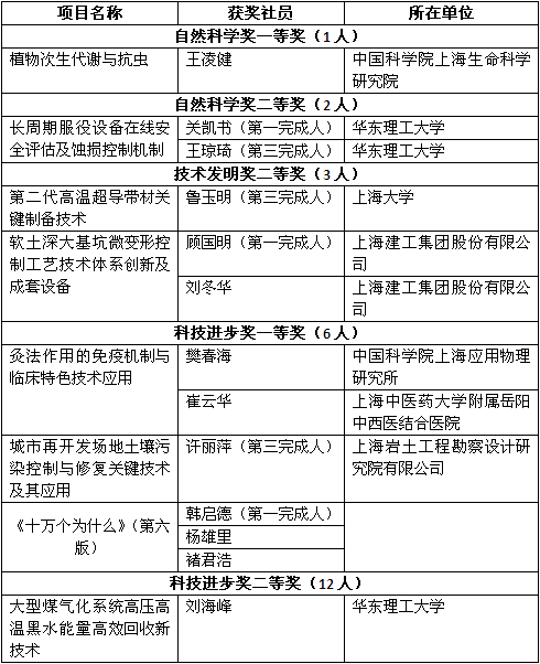 39位社员主持或参与的40个项目分别获得2017年度上海市自然科学奖、技术发明奖、科技进步奖。其中,九三学社中央原主席韩启德(第一完成人),中国科学院院士杨雄里和褚君浩等完成的《十万个为什么》(第六版)获年度上海市科技进步奖一等奖。