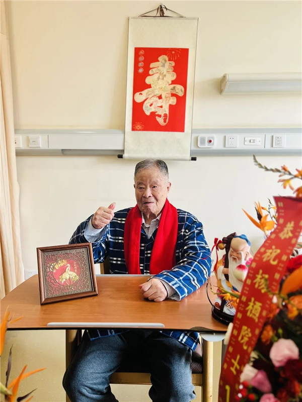 医护人员为杨老戴上喜气的红围巾,杨老容光焕发,精神矍铄,他笑着说:“大家太客气了,我现在一切情况都很好!”